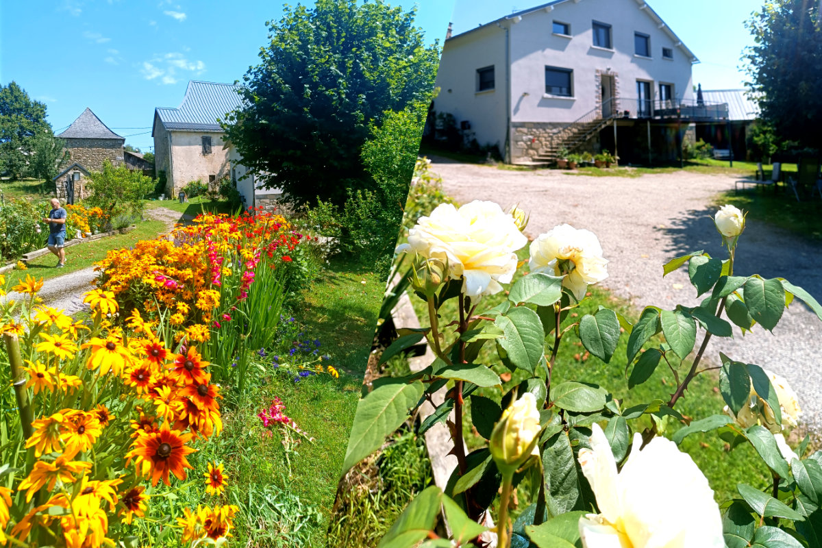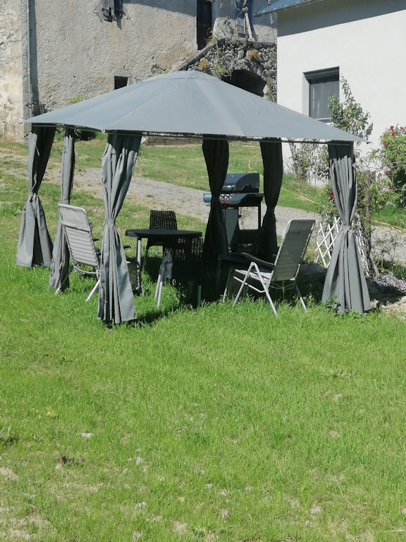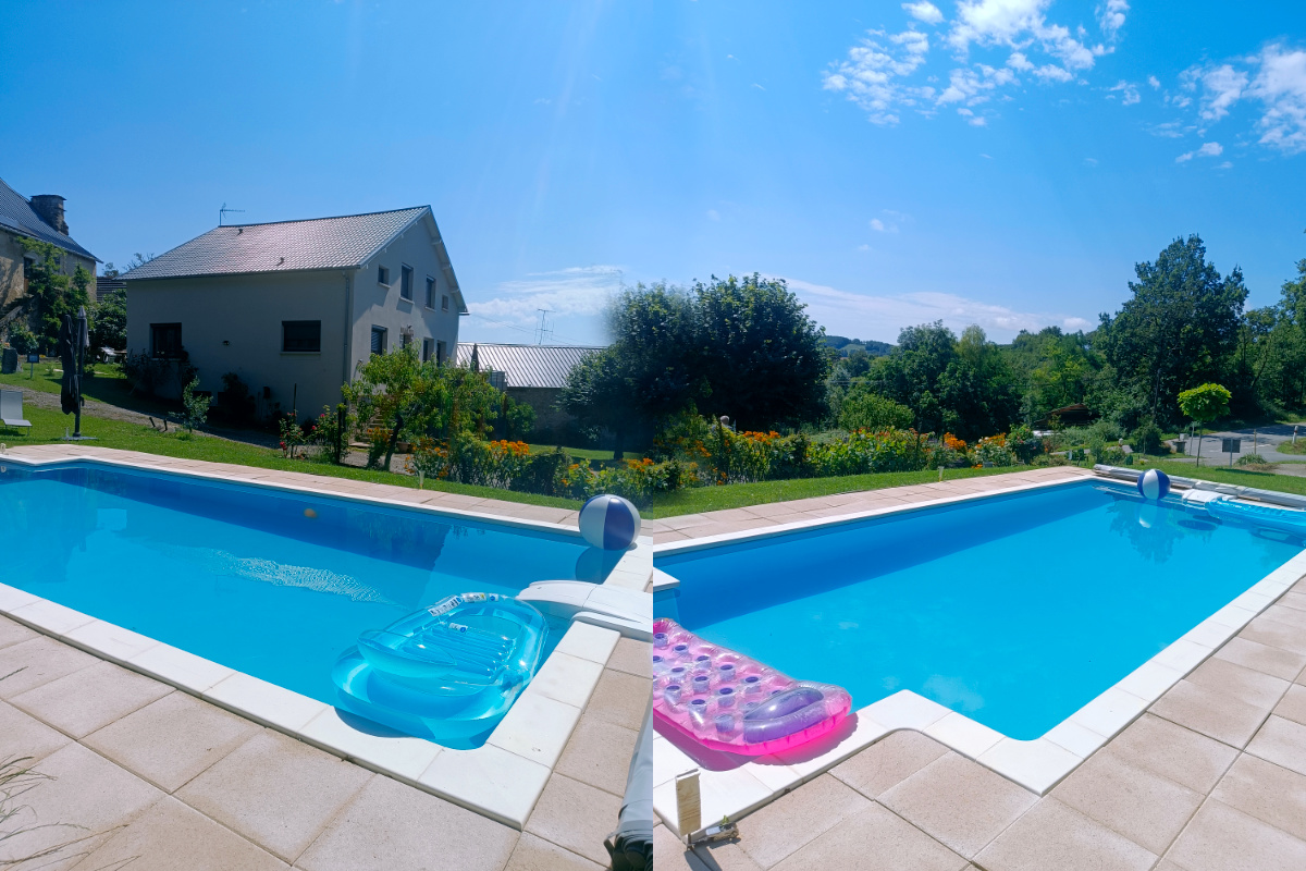 Grand parc privatif avec piscine, coins aménagés salon de jardin et plancha.